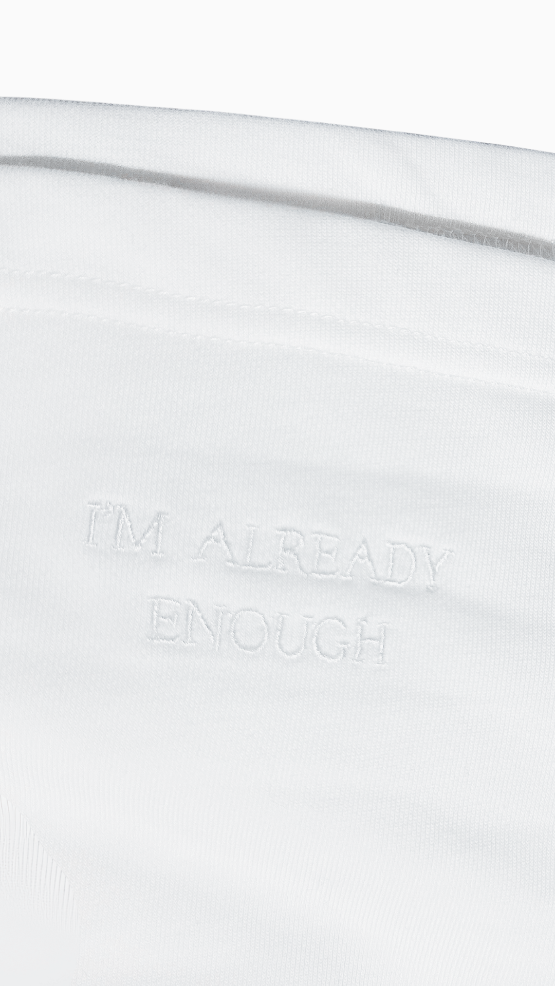 Our signature message embroidered upside-down, I’m already enough, only visible to you.