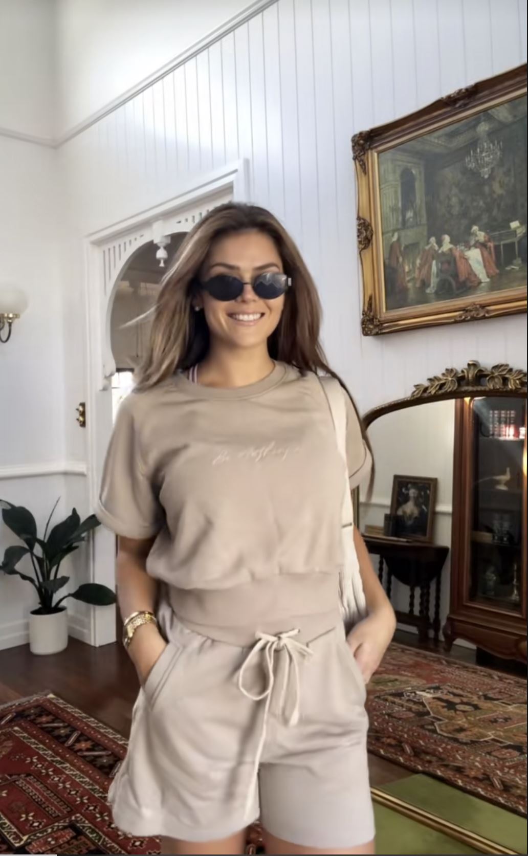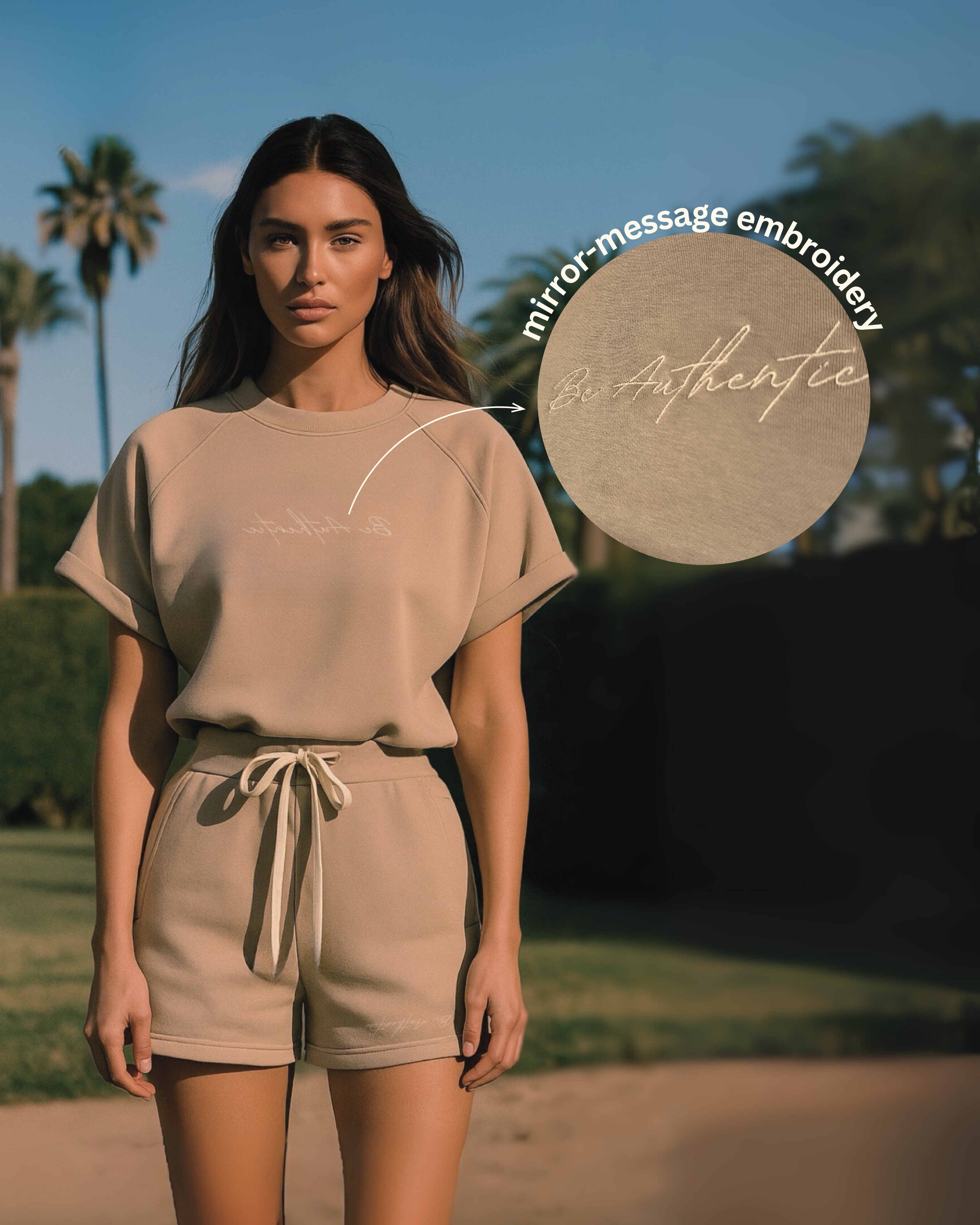 The material is very high quality and the design itself is super flattering on the body. I really like the way the sleeves holds its structure. The embroidery on the set is not super obvious which gives a nice personal touch. Such a great idea to write the text backwards to that we get affirmations every time we look into the mirror 🥹 Will be wearing this every day!!